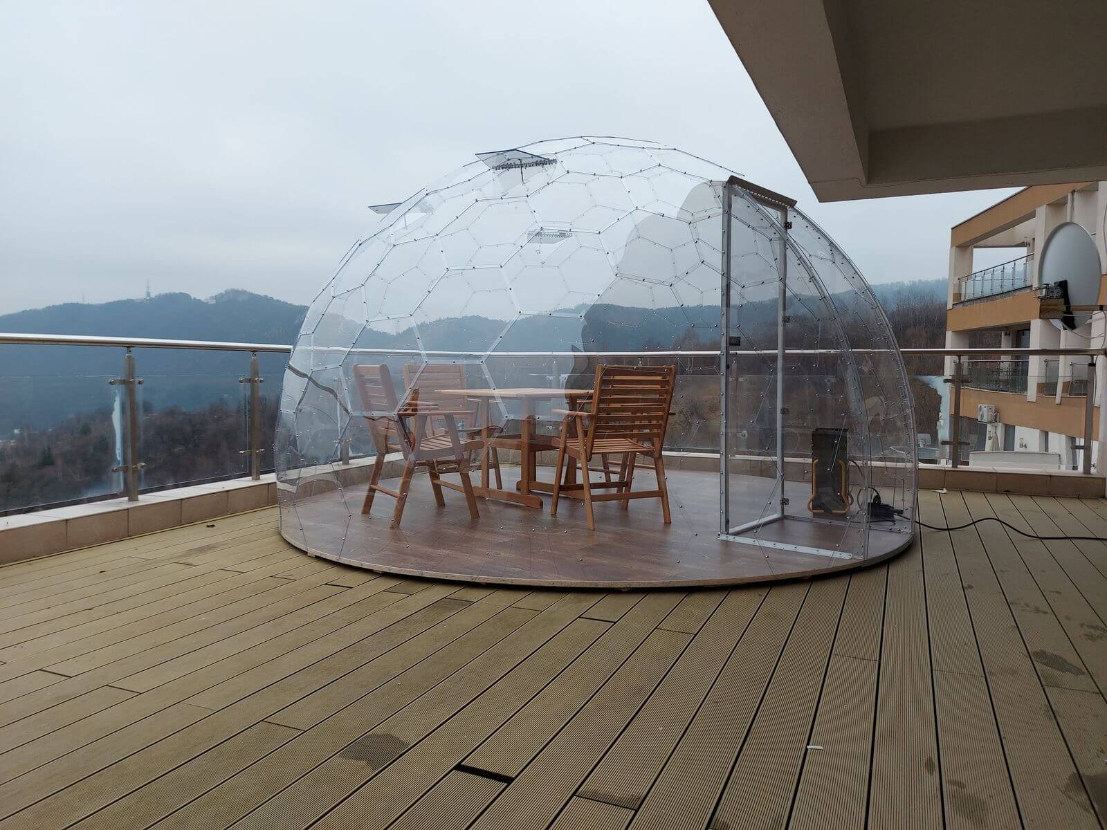 Οι θόλοι της σειράς G είναι πολύ ανθεκτικοί λόγω της συναρμολόγησης στη γεωδαιτική μορφή, χωρίς να απαιτείται σκελετός. Έτσι, προκύπτει ένας απόλυτα διαφανής θόλος, με απόλυτη θέα. Όλοι οι θόλοι μας παραδίδονται με πολυκαρβονική πόρτα πάχους 6mm και μαγνητικό κλείσιμο σε 3 ή 4 σημεία.